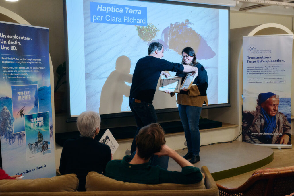 Le Grand Prix du Jury et le Prix de l’Exploration au féminin, assortis respectivement d’une dotation de 5000 € et 3 000 €, ont été remis à la neuroscientifique Clara Richard pour son projet Haptica Terra, une exploration scientifique et artistique consacrée au rôle du toucher dans la relation entre humains et nature.