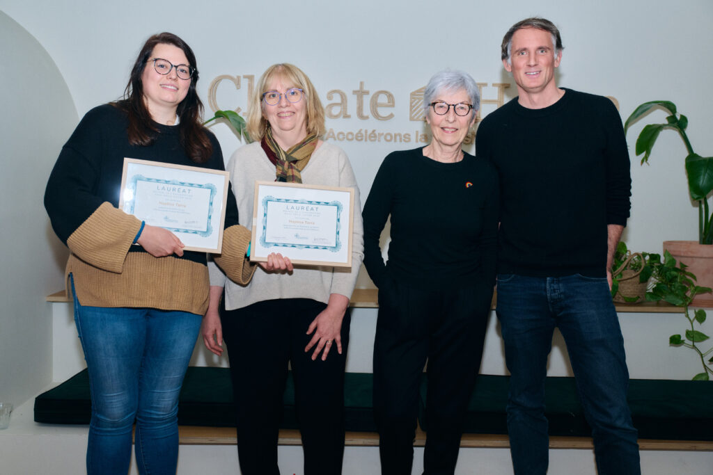 Les quatre membres du jury (la navigatrice Tamara Klink, l’ingénieur Corentin de Châtelperron, le journaliste Raphaël de Casabianca et la directrice Nature et Société d’Engie Elsa Favrot Monier, accompagnés de Daphné Victor, présidente du Fonds PEV, et de l’équipe de la Bourse ont distingué trois projets parmi les dizaines de propositions reçues.